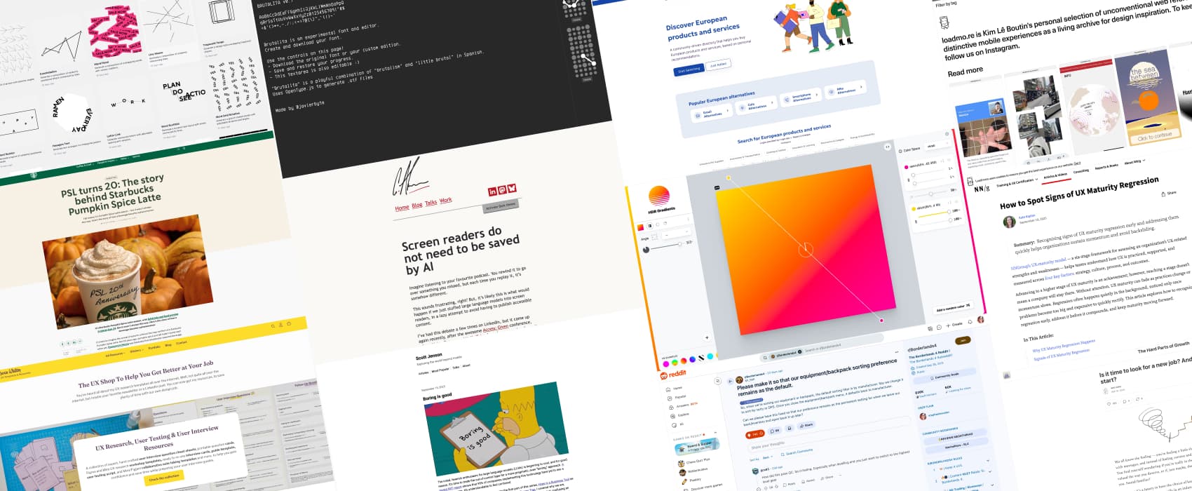 Pixels of the Week is my weekly-ish curated newsletter for designers, UX folks, devs, and anyone building accessible, inclusive, usable (and let’s be honest, awesome) digital products. I share interesting articles, tools, inspiration, and resources I found during the week. This is the archive version. If you’d rather get it straight in your inbox (plus be notified when I publish other articles), subscribe to my newsletter.